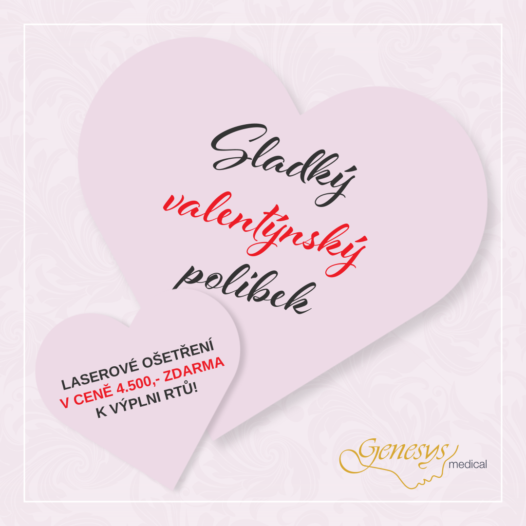Přesně za dva týdny je tu svátek všech zamilovaných - svatý Valentýn. Překvapte svou drahou polovičku nezapomenutelným dárkem - sladkým polibkem plnými a smyslnými rty. V Genesys Medical vám s tím rádi pomůžeme. Naše vrchní lékařka MUDr. Jana Synková je totiž uznávanou specialistkou na výplně rtů kyselinou hyaluronovou. Výsledkem jsou vždy přirozené, symetrické a plné rty k zulíbání.